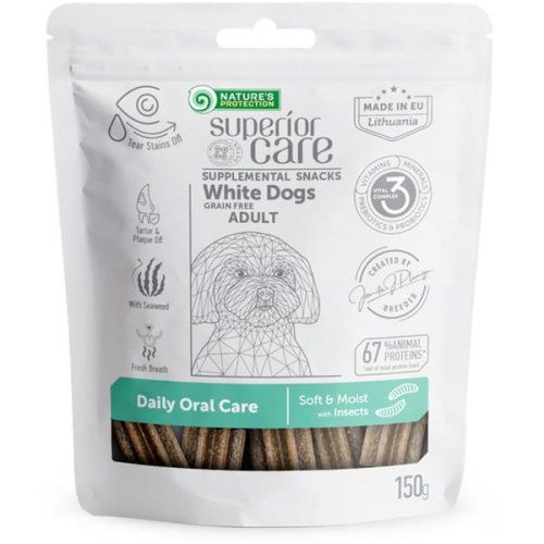 Nature’s Protection Superior Care White Dogs Adult Daily Oral Care je prémiový doplněk stravy s hmyzem vyvinutý speciálně pro dospělé psy všech plemen s bílou nebo světlou srstí pro udržení dobrého zdraví ústní dutiny a zubů. Žvýkací tyčinky díky speciálnímu tvaru účinně čistí plak ze zubů psa. Jsou grain-free – neobsahují obiloviny, které by mohly způsobit alergické reakce. Mají vyvážené množství probiotik a prebiotik, díky čemuž přispívají k harmonizaci střevního prostředí, podporují zdravé střevní bakterie a napomáhají hladkému trávení. Obsahují: