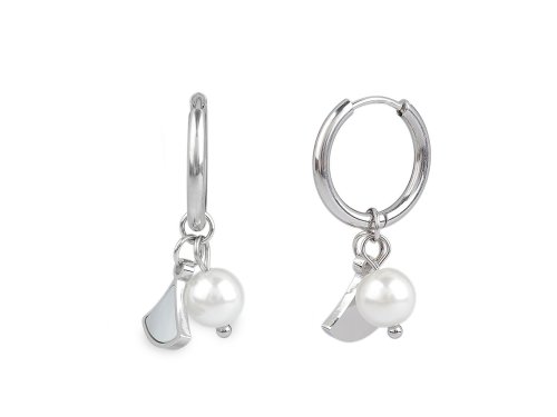 Náušnice kroužky jsou vyrobené z kvalitní nerezové oceli. Dole jsou ozdobené přívěskem perly a lístečku s vsazenou imitací perleti. Jsou velice elegantní, oceníte je ke každodennímu nošení, ale i ke slavnostním příležitostem. Skvěle doplní byznys styl oblékání, ležérní outfity i společenské šaty. Dají se rozevřít, zapínají se zacvaknutím. Přívěsky lze z kroužku sundat a nosit ho jen samotný, neozdobený.