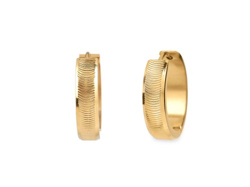 Elegantní kruhové náušnice jsou ideálním doplňkem pro ženy, které hledají stylovou, ale nenápadně elegantní ozdobu. Jsou vyrobené z kvalitní nerezové oceli, povrch mají ozdobený reliéfem, který způsobuje zajímavé světelné odlesky. Hodí se k jakémukoliv outfitu, oblíbíte si je na každodenní nošení. Zapínají se zacvaknutím.