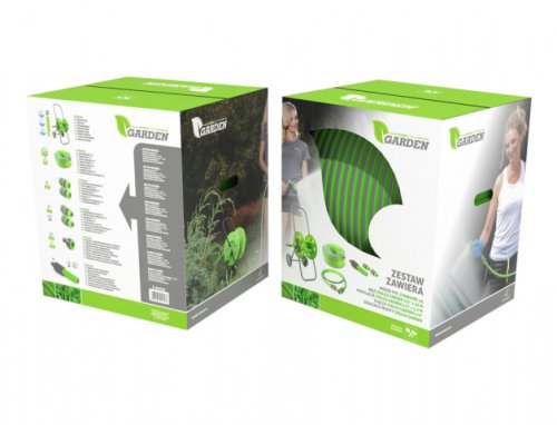 Zavlažovací set obsahuje: naviják, hadici 1/2 o délce 20 metrů, přípojku 1/2 o délce 1,2 m, regulovatelnou proudnici, adaptér na kohoutek 1/2 a 3/4, rychlospojku a stop rychlospojku.