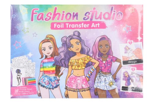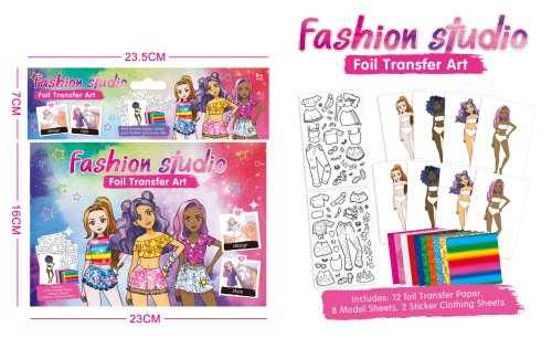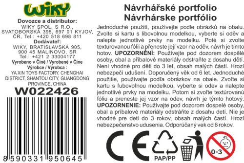 Návrhářské portfolio. Obsahuje 8 modelek, 2 listy šablon oblečení, 12 barevných lepicích fólií. Obrázkový a textový návod na zadní straně obalu.