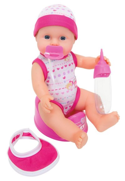 Panenka New Born Baby pije a čůrá. Vhodná na koupání (pevné celé tělíčko). Balení obsahuje lahvičku, dudlík, nočník a bryndák. Výška 30 cm.
