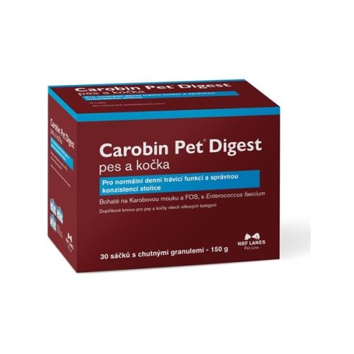 NBF Lanes Carobin Pet Digest je přírodní doplňkové krmivo ve formě prášku určené pro psy a kočky všech věkových kategorií. Obsahuje karobovou moučku, fruktoligosacharidy (FOS) a probiotikum Enterococcus faecium, které podporují správnou funkci trávicího traktu. Působí proti nadýmání, zápachu z tlamy, kručení v břiše a koprofágii. Zlepšuje konzistenci stolice a přispívá k hygieně perianální oblasti. Neobsahuje živočišné bílkoviny, a je tudíž vhodné i při dietním režimu. Složení: karobová moučka 52,5 %, FOS (fruktoligosacharidy) 20 %, kvasnice (pivovarské kvasnice), pyrofosfát sodný, lupinová proteinová moučka, hořečnatá sůl kyseliny stearové, chlorid sodný, rostlinné oleje a tuky (slunečnicový), laktóza. Doplňkové látky: Nutriční přísady: provitamíny a chemicky přesně definované látky s podobným účinkem: vitamín B12 (kyanokobalamin) 3 mg/kg. Zootechnické přísady: stabilizátory střevní mikroflóry: 4b1707 Enterococcus faecium DSM 10663-NCIMB 10415 (1,0×1011 CFU/kg). Technologické přísady: srážený oxid křemičitý, 1b306 (i) tokoferoly extrahované z rostlinných olejů. Dávkování: 1 sáček denně Návod k použití: Podávejte psům a kočkám perorálně. Smíchejte obsah sáčku s běžným krmivem, ideálně mokrým. Pokud používáte suché krmivo, mírně je navlhčete, aby se prášek lépe přichytil a zvíře jej bez potíží přijalo. Nepřekračujte doporučené dávkování. Upozornění: Zvířeti vždy zajistěte čerstvou pitnou vodu. Určeno pouze pro zvířata! Uchovávejte mimo dosah dětí. Před zahájením užívání se doporučuje konzultace s veterinárním lékařem.