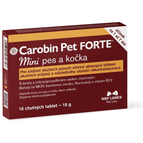 NBF Lanes Carobin Pet Forte Mini je nutriční doplněk určený k úpravě narušené střevní absorpce během akutního průjmu a při následném období rekonvalescence psů a koček všech věkových kategorií. Obsahuje mikroenkapsulované třísloviny, oxid zinečnatý, karobovou moučku, MOS a vitamín B12. Hlavní přednosti: