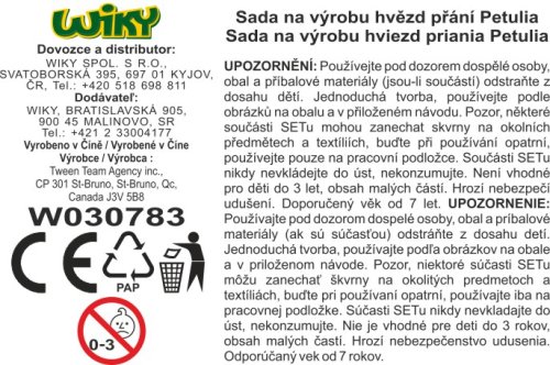 10 hvězd z papírové hmoty, 5 mini lahviček, 2 lahvičky s barvou, lahvička s inkoustem ve spreji, 6 stránek s inspirativních vzkazů, flitry a třpytivý prášek, papírové konfety, lepidlo, 40 korálků, 5 provázků, stránka s nálepkami, štětec, plastová hůlka, Petuliin příběh, pokyny