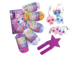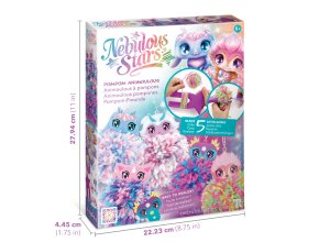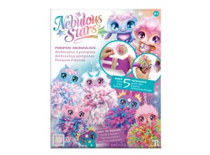 Nebulous Stars Bambulka animouš. Obsahuje 5 držáků na bambulky s animoušem, 5 barev akrylové příze, 1 nástroj na výrobu bambulek, příběh zvířátek, barevné pokyny.