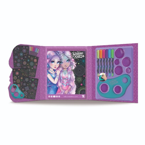 Nebulous Stars Maluj hvězdné spirály set. Obsah balení - 48 černých stránek, šablona na spirály a 7 koleček, 6 neonových gelových per, stránka se samolepkami. 36 stránek má ilustrace které můžete vybarvit a doplnit spirálami.