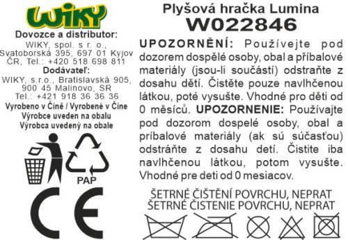 Seznam varování týkajících se bezpečnosti maskotů, zejména zvířat, založený na požadavcích nařízení (EU) 2023/988 o obecné bezpečnosti výrobků (GPSR): * Ujistěte se, že plyšák neobsahuje malé části, které by mohly být spolknuty dítětem, což představuje nebezpečí udušení. Pravidelně kontrolujte, zda jsou švy pevné a dekorativní prvky jsou dobře připevněny. * Věnujte pozornost materiálu, z něhož je plyšák vyrobena. Vyhýbejte se výrobkům obsahujícím toxické látky nebo barviva, které mohou způsobovat alergie nebo podráždění pokožky. * Pokud má plyšák dlouhé vlasy nebo kožíšek, pravidelně je kartáčujte, abyste zabránili tvorbě žmolků, ve kterých se mohou hromadit bakterie a nečistoty. * Ujistěte se, že plyšák nemá žádné ostré nebo tvrdé prvky, které by mohly dítě při hře zranit. * Pravidelně perte maskota podle pokynů výrobce, abyste odstranili prach, nečistoty a potenciální alergeny. * Zkontrolujte, zda má hračka certifikát shody s bezpečnostními normami, např. CE. * Plyšáci s granulovanou výplní (např. Polystyrenové kuličky mohou představovat nebezpečí v případě poškození hračky a rozsypání výplně. Takovým výrobkům pro malé děti je třeba se vyhnout. * Varuji před zanecháním plyšáci v postýlce dítěte, protože to může zvýšit riziko náhlého úmrtí postýlky (SIDS). * Pokud si všimnete jakéhokoli poškození plyšáci, okamžitě ji opravte nebo vyměňte za novou, abyste se vyhnuli potenciálním rizikům.