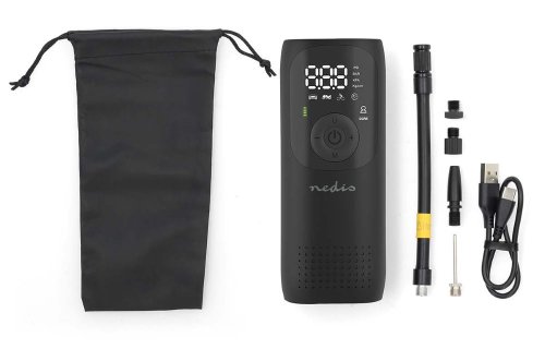 Výkonný multifunkční kompresor kapesních rozměrů s přehledným LED displejem, svítilnou a baterií o kapacitě 4000 mAh. Rychlost proudění vzduchu činí až 12 litrů za minutu a k dispozici jsou 4 režimy huštění: automobil, motocykl, jízdní kolo a míč. Automaticky se zastaví, když dosáhne nastaveného tlaku. Součástí balení je flexibilní vzduchová hadice, kulová jehla, pouzdro na přenášení, adaptér na ventil Presta a Dunlop, kroužková tryska a nabíjecí USB-C kabel. Plné dobití baterie trvá přibližně 3 hodiny a na jedno nabití dokáže dofouknout přibližně 8 pneumatik automobilu z 2,0 na 2,4 baru.