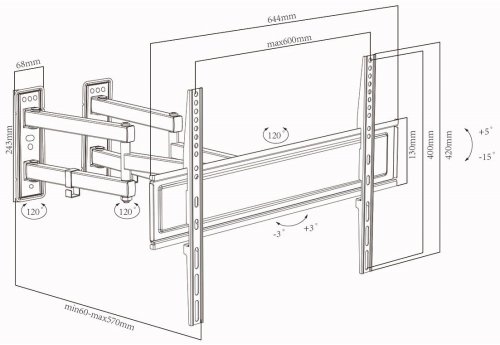 Držák na zeď pro montáž televizí s úhlopříčkou 32" až 70". Možný náklon -15° až 5°, otáčení v rozsahu 45° a natočení o 3°. Maximální zatížení tohoto držáku je 40 kg. Držák disponuje praktickým organizérem kabelů.