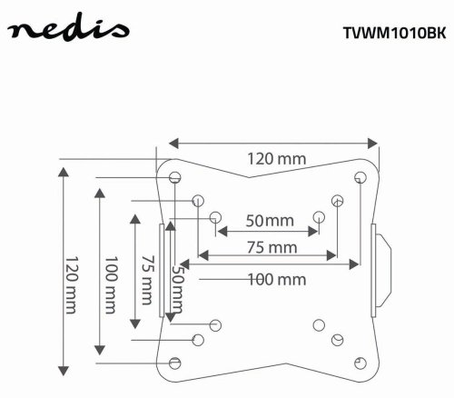 Držák podporuje tři nejběžnější VESA standardy: 50 × 50, 75 × 75 a 100 × 100 mm, což zajišťuje kompatibilitu s většinou televizorů v dané velikostní kategorii.