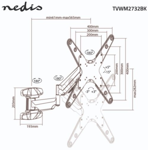 Tento vysoce flexibilní vertikální nástěnný držák nabízí kompletní řešení pro optimální umístění televizoru v jakékoliv místnosti. Díky třem otočným bodům umožňuje otáčení až 180°, naklápění v rozsahu 15° a plynulé nastavení vzdálenosti od stěny mezi 61 až 565 mm.