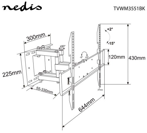 Dvojramenná konstrukce s 6 kloubními body poskytuje maximální svobodu pohybu. Televizor můžete vytáhnout až 330 mm od zdi, otočit o 90° nebo naklonit podle potřeby pro ideální úhel sledování.