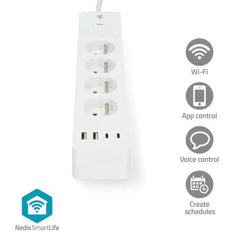 Wi-Fi | 2x USB-A / 2x USB-C™ / 4x plug with earth contact (CEE 7/5) | 16 A | 3680 W | 2.00 m | 0 - 55 °C | Android™ / IOS | Bílá