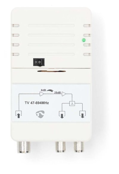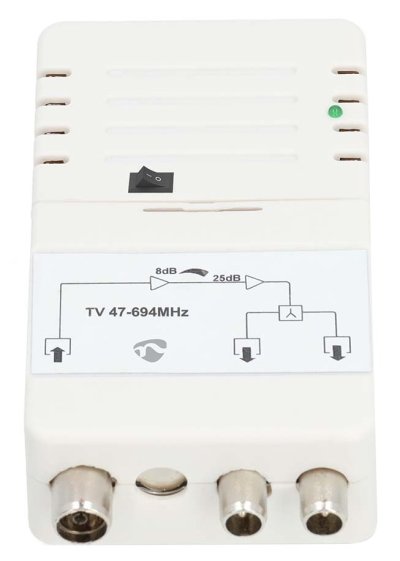 Zesilovač je vybaven LTE-700 filtrem, který účinně potlačuje rušení od 5G sítí a zajišťuje stabilní příjem televizního signálu. Kompaktní bílé provedení z materiálu ABS a zinková slitina zaručuje spolehlivý provoz s integrovaným 230 V napájecím adaptérem.