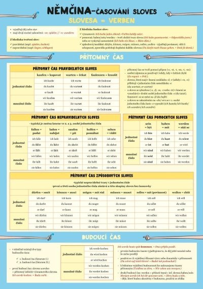 Laminátová kartička určená především pro žáky základních a středních škol nabízí graficky přehledný a stručný přehled časování německých sloves. Najdete zde přehled všech koncovek a pravidel ve všech osobách v různých časech.