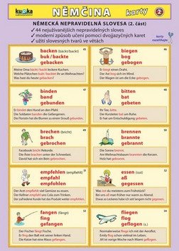 Karty k procvičování německých nepravidelných sloves včetně jejich užití ve větách. Obsahuje dalších 44 nejužívanějších německých nepravidelných sloves a souhrnnou záložku se všemi tvary.