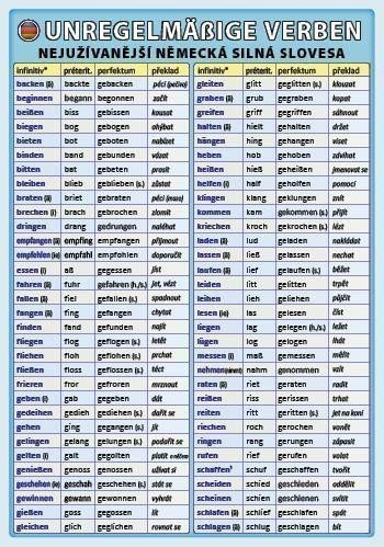 Přehled tvarů préterita a perfekta nejužívanějších německých silných sloves a smíšených sloves. Nezbytná pomůcka pro všechny studenty němčiny. Obsahuje upozornění na změny 2. a 3. osoby přítomného času, tvoření tvarů préterita a perfekta slabých, silných a smíšených sloves.