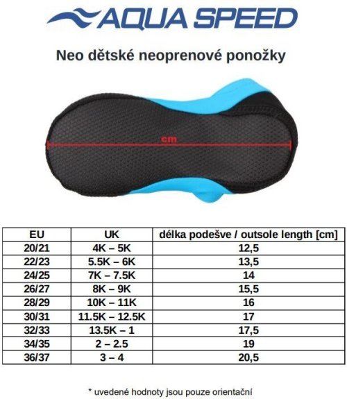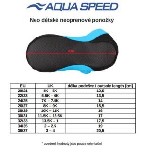 Dětské neoprenové ponožky Aqua-Speed Neo jsou více, než jen zajímavý doplněk pro děti na pláž nebo k bazénu. Ponožky jsou skladné, lehké, pohodlné, snadno se nazouvají, nebrání v přirozeném pohybu a hlavně poskytují ochranu před horkým pískem, chrání chodidla na kamenitých plážích a v případě bazénů minimalizují riziko uklouznutí. Ponožky jsou vyrobeny z měkkého a elastického materiálu v horní části a silnějšího neoprenu na podrážce s protiskluzovým povrchem. Material: Neopren (50% Polyester 50% Guma SBR); 80% Polyamid 20% Elastan