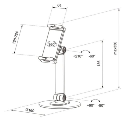 Stolní držák pro tablet s úhlopříčkou 4,7" až 12,9" umožňuje pohodlné nastavení výšky až 33 cm, náklonu v rozsahu 270°, otáčení v rozsahu 104° a rotaci 360°. Pevná základna s protiskluzovými silikonovými podložkami zajistí pevné umístění vašeho zařízení.