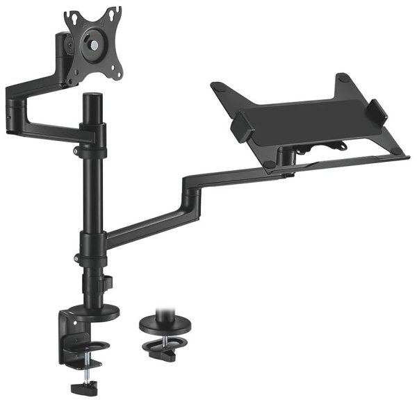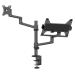 Flexibilní stolní VESA držák pro notebook a plochý LCD monitor o velikosti 17" až 27" a hmotnosti do 8 kg + 5 kg notebook. Držák je manuálně výškově nastavitelný v rozmezí od 27,5 do 55,5 cm. Tento stolní držák je vhodný pro obrazovky, které splňují vzor otvorů VESA 75 × 75 , 75 × 100 a 100 × 100 mm. Různé vzory otvorů lze pokrýt pomocí VESA adaptérů (nejsou součástí balení). Díky krátkému hornímu rameni T-Rex je při umístění v blízkosti stěny nutná pouze minimální hloubka. Potěší také systém pro úhledné vedení kabelů. Balení obsahuje stolní svorku i průchodku.