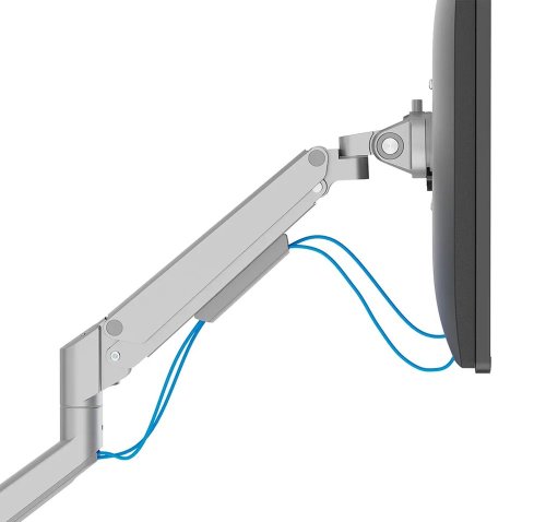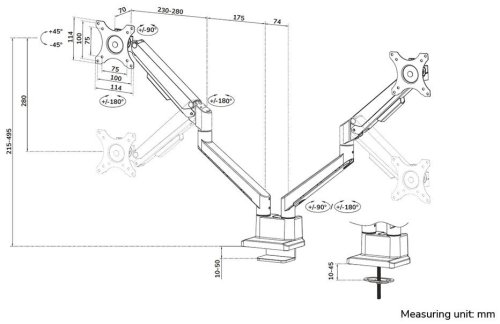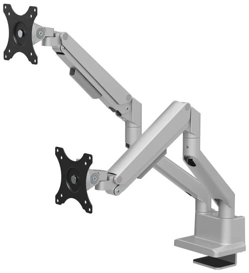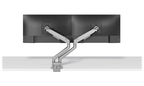 Plně pohyblivý stolní držák pro dva ploché nebo zakřivené monitory s úhlopříčkou 17" až 32" a maximální hmotností 18 kg (2× 9 kg). Všestranná technologie naklápění, otáčení a rotace umožňuje vytvořit optimální pozorovací úhel. Držák má nastavitelnou výšku 21,5–49,5 cm, hloubku 7–52,5 cm a je vhodný pro obrazovky, které odpovídají vzoru otvorů VESA 75 × 75 až 100 × 100 mm. Potěší také systém pro úhledné vedení kabelů. Balení obsahuje stolní svorku i průchodku.