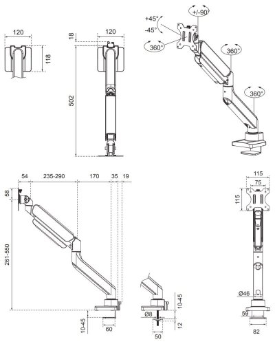 Flexibilní stolní VESA držák pro zakřivené LCD monitory o velikosti 17" až 49" a hmotnosti do 14 kg (nezakřivené monitory až 18 kg). Je vybaven zesílenou hlavou a navržen tak, aby podporoval vyšší zatížení. Nastavení výšky pomocí plynové pružiny v rozmezí od 26,1 až 55,5 cm. Univerzální technologie naklápění, otáčení a natáčení umožňuje optimální nastavení. Balení obsahuje stolní svorku i průchodku.