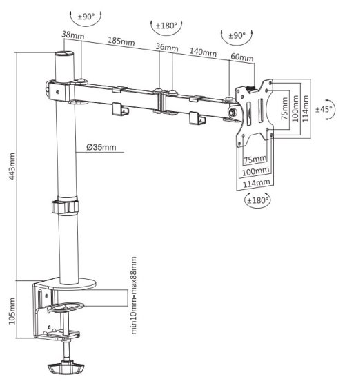 Flexibilní stolní VESA držák pro plochý LCD monitor o velikosti 10" až 32" a hmotnosti do 8 kg. Držák je manuálně výškově nastavitelný v rozmezí od 0 do 44 cm. Tento stolní držák je vhodný pro obrazovky, které splňují vzor otvorů VESA 75 × 75 nebo 100 × 100 mm. Různé vzory otvorů lze pokrýt pomocí VESA adaptérů. Veškerý instalační materiál je součástí výrobku.