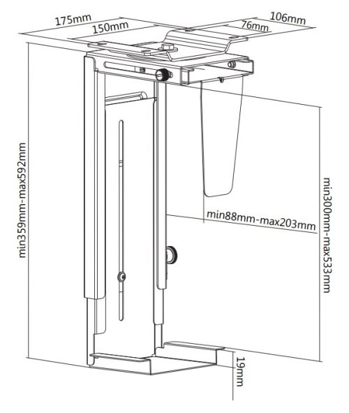 Otočný držák pro vertikální montáž počítače pod stůl či na stěnu. Snadno nastavitelná šířka a výška pro většinu stolních a věžových počítačů. Držák lze otáčet o 360°. Uvedené specifikace udávají maximální a minimální šířku a hloubku držáku.