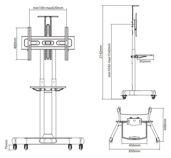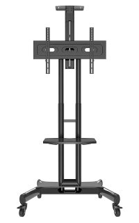 Mobilní podlahový stojan pro ploché obrazovky s úhlopříčkou od 32" do 75" a hmotností až 50 kg. Držák je manuálně výškově nastavitelný v rozmezí 104,2 až 154,2 cm. Navíc disponuje 2 policemi pro příslušenství a kameru.