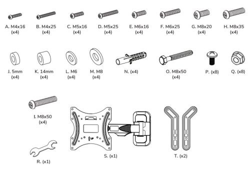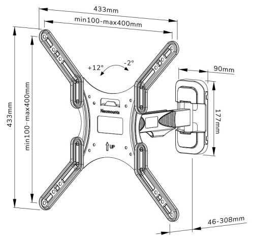 Velikost obrazovky: 32"–55" Maximální nosnost: 35 kg Vzdálenost obrazovky od zdi: 46–308 mm Rozměry VESA: 100 × 100, 200 × 100, 200 × 200, 200 × 300, 200 × 400, 300 × 200, 300 × 300, 400 × 200, 400 × 300, 400 × 400 mm Náklon: -2° až +12° Úhel otáčení: 30° Materiál: ocel Barva: černá