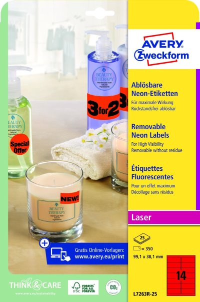• Snímatelné etikety Avery Zweckform neonově červené barvy - etikety snadno upoutají pozornost, jsou ideální pro vytvoření dobře viditelných označení, při prodeji výrobků, promočních aktivitách nebo speciálních nabídkách