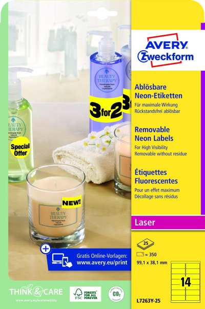 • Snímatelné etikety Avery Zweckform neonově žluté barvy - etikety snadno upoutají pozornost, jsou ideální pro vytvoření dobře viditelných označení, při prodeji výrobků, promočních aktivitách nebo speciálních nabídkách