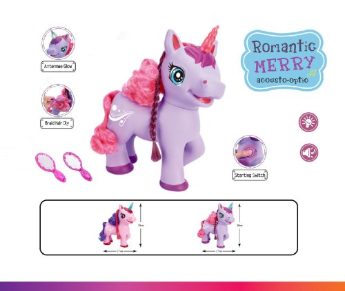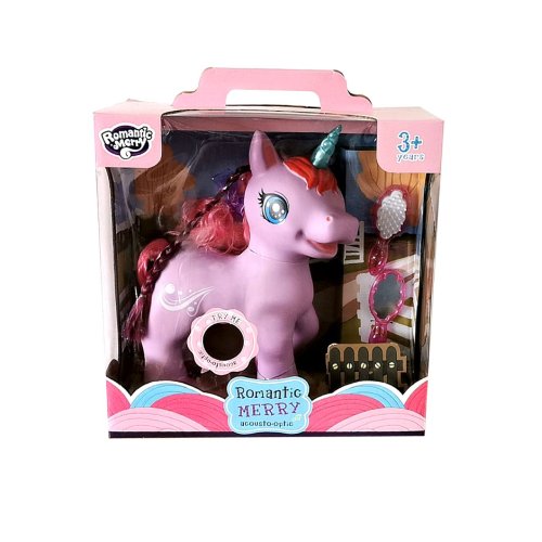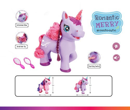 Jednorožec na baterie s příslušenstvím. Po stistknutí tlačítka na bříšku jednorožce začne vydávat zvuky a zpívat anglickou písničku a při zvuku svítí roh. Příslušenství hřebínek na česání dlouhé hřívy a zrcátko.