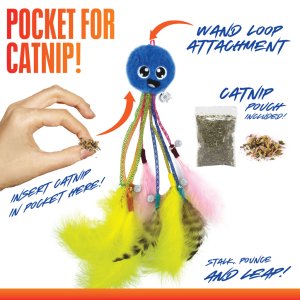 Hračka je navržena pro interaktivní hru s kočkou – plyšová chobotnička s pružným lankem a hůlkou, která umožňuje majiteli ovládat hračku a tím podněcovat kočku k honění, skákání či dovádění. Hračka má přibližně 30 cm. Tělo hračky kombinuje odolný nylonový plášť s „ultraplush“ povrchem (měkký, příjemný na dotek) a pružná lanka/„nohy“ chobotnice, které při pohybu vibrují či se vlní – to napodobuje pohyb kořisti a stimuluje kočku. V konstrukci jsou zabudovány také rolničky, které zvyšují zájem kočky o hru. Dále hračka obsahuje tyčku se šňůrou, což umožňuje majiteli vést hru – pohybovat hračkou ve vzduchu či po zemi, a tím aktivovat kočičí lovecké instinkty. Povrch nylonu je barevný a kontrastní, což činí hračku výraznou v prostoru a zvyšuje její atraktivitu. Je vhodná pro společnou hru mezi kočkou a majitelem – tišší hry, honičku či obratnost.