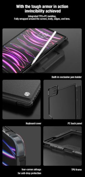 Nillkin Bumper Go Keyboard Case je víceúčelový ochranný kryt tabletu s odnímatelnou podsvícenou klávesnicí, slotem pro Apple Pencil a plynule nastavitelným úhlem tabletu. Chcete svůj tablet využívat jako mobilní kancelář, jako náhradu za těžký notebook, nebo vás prostě jen tablet baví? Tak přesně pro vás je zde víceúčelový ochranný kryt Nillkin. Kryt vám nabídne špičkově zpracovanou odnímatelnou bezdrátovou klávesnici s nízkým zdvihem, tichými a odolnými spínači a precizní profilací kláves pro to nejpohodlnější psaní. Klávesnice je také vybavena podsvícením, u kterého máte možnost si zvolit barvu a úroveň podsvícení. Na výběr je 7 různých barev a 4 úrovně podsvícení. V nepřetržitém provozu vám klávesnice vydrží až 55 hodin. Se zapnutým podsvícením se výdrž snižuje na 5 hodin. Na zadní straně naleznete praktickou opěrku pro tablet s plynulým nastavením úhlu. Na bocích se nachází praktické uši díky kterým je přenáší ještě snazší. Tablet lze opřít jak klasicky na šířku, tak i na výšku. Ať už pro práci s grafikou, psaní textů nebo čtení knih, vybere si prostě každý. Ochranný kryt se skládá z TPU + PU materiálu, který chrání váš tablet před poškozením. Navíc je opatřen zesílenými rohy a posuvným krytem fotoaparátu pro ještě větší ochranu.