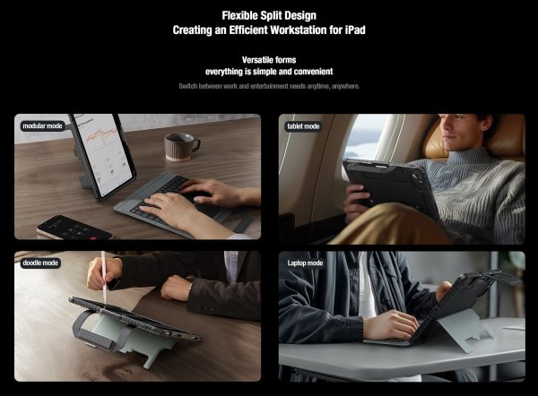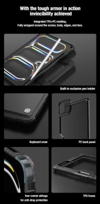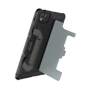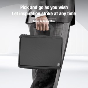 Nillkin Bumper Go Keyboard Case je víceúčelový ochranný kryt tabletu s odnímatelnou podsvícenou klávesnicí, slotem pro Apple Pencil a plynule nastavitelným úhlem tabletu. Chcete svůj tablet využívat jako mobilní kancelář, jako náhradu za těžký notebook, nebo vás prostě jen tablet baví? Tak přesně pro vás je zde víceúčelový ochranný kryt Nillkin. Kryt vám nabídne špičkově zpracovanou odnímatelnou bezdrátovou klávesnici s nízkým zdvihem, tichými a odolnými spínači a precizní profilací kláves pro to nejpohodlnější psaní. Klávesnice je také vybavena podsvícením, u kterého máte možnost si zvolit barvu a úroveň podsvícení. Na výběr je 7 různých barev a 4 úrovně podsvícení. V nepřetržitém provozu vám klávesnice vydrží až 55 hodin. Se zapnutým podsvícením se výdrž snižuje na 5 hodin. Na zadní straně naleznete praktickou opěrku pro tablet s plynulým nastavením úhlu. Na bocích se nachází praktické uši díky kterým je přenáší ještě snazší. Tablet lze opřít jak klasicky na šířku, tak i na výšku. Ať už pro práci s grafikou, psaní textů nebo čtení knih, vybere si prostě každý. Ochranný kryt se skládá z TPU + PU materiálu, který chrání váš tablet před poškozením. Navíc je opatřen zesílenými rohy a posuvným krytem fotoaparátu pro ještě větší ochranu.