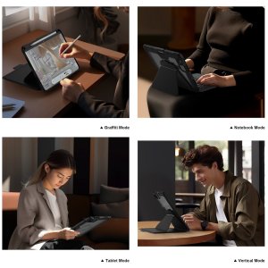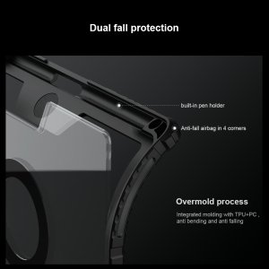 Nillkin Bumper Link Keyboard Case je víceúčelový ochranný kryt tabletu s odnímatelnou podsvícenou klávesnicí, slotem pro Apple Pencil a plynule nastavitelným úhlem tabletu. Chcete svůj tablet využívat jako mobilní kancelář, jako náhradu za těžký notebook, nebo vás prostě jen tablet baví, tak přesně pro vás je zde víceúčelový ochranný kryt Nillkin. Kryt vám nabídne špičkově zpracovanou odnímatelnou bezdrátovou klávesnici s nízkým zdvihem, tichými a odolnými spínači a precizní profilací kláves pro to nejpohodlnější psaní. Součástí odnímatelné klávesnice je také praktická opěrka pro tablet s plynulým nastavením úhlu. Klávesnice je také vybavena podsvícením, u kterého máte možnost si zvolit barvu a úroveň podsvícení. Na výběr je 7 různých barev a 4 úrovně podsvícení. Na kryt se uchytí pomocí magnetu, který je integrovaný na zadní straně krytu. Díky magnetu můžete kryt nastavit jak na šířku, tak na výšku. Kryt má integrovaný slot s nabíjením přímo pro Apple Pencil. Můžete ho tak mít vždy s sebou a co je hlavní, bude vždy plně nabitý. O nabíjení Apple Pencil a napájení bezdrátové klávesnice se stará baterie s kapacitou 500mAh. V nepřetržitém provozu (s vypnutým podsvícením) vám klávesnice vydrží až 100 hodin. Se zapnutým podsvícením vydrží až 14 hodin. Kryt se skládá z TPU + PU materiálu, který chrání váš tablet před poškozením. Navíc je opatřen zesílenými rohy a posuvným krytem fotoaparátu pro ještě větší ochranu.