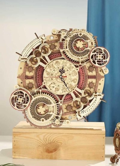 Mechanické dřevěné 3D puzzle. Poskládej si propracovaný model funkčních nástěnných hodin s krásnými detaily, kalendářem a tichým hodinovým strojkem za pomoci obrázkového návodu. V balení se nacházejí dřevěné desky s předřezanými díly a hodinový strojek, které do sebe zapadají. Rozměry poskládaného modelu jsou 335x295x55 mm. Vhodné pro manuálně zručné lidi 14+.