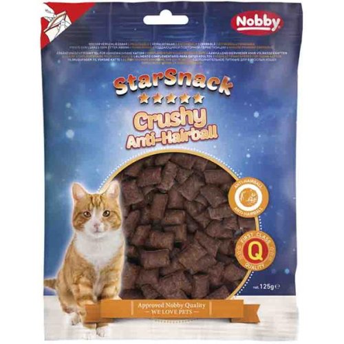 Přírodní pamlsky Nobby Starsnack pro dospělé kočky na podporu trávení a průchodnost chlupových smotků. Křehké polštářky plněné krémovou náplní s přírodní vlákninou a taurinem. Pamlsky jsou lahodnou pochoutkou pro každou kočku. Jsou vyrobeny z přírodních surovin, a proto jsou kočkou velmi dobře přijímány. Složení: cereálie, maso a živočišné produkty, oleje a tuky, rostlinné bílkoviny, vedlejší rostlinné produkty (3 % lignocelulóza), minerály. Analytické složky: hrubý protein 30 %, obsah tuku 20 %, hrubý popel 5,5 %, hrubá vláknina 4 %. Nutriční doplňkové látky na 1 kg: vit. A 10000 IU, vit. D3 650 IU, vit. E 90 mg, taurin 100 mg. Doplněno o antioxidanty. Dávkování: Podávejte jako pamlsek, max. 15 ks za den. Podávejte pod dohledem, ideálně z ruky jako odměnu a pamlsek na základě vyvážené stravy. Nezapomínejte na přístup čerstvé vody.