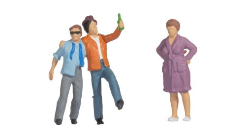 Sada figurek Veselí kamarádi přináší na vaši modelovou železnici zábavnou a velmi realistickou scénku. Dva dobří kamarádi si zjevně užili příjemný večer a teď se v dobré náladě, ruku v ruce a s lahví v ruce, vracejí domů. Na jejich návrat už ale čeká třetí postava – rázná paní v županu se založenýma rukama a přísným pohledem. Je zřejmé, že z jejich nočního výletu není zrovna nadšená. Tato humorná scénka se skvěle hodí do městských nebo vesnických zákoutí vašeho kolejiště a zaručeně vykouzlí úsměv na tváři každého pozorovatele. Veselí kamarádi vnáší do modelového světa kousek každodenního života s nadhledem a vtipem. Hlavní vlastnosti: jedná se o model, nejedná se o hračkuručně kolorovánovhodné od 14 letměřítko H0