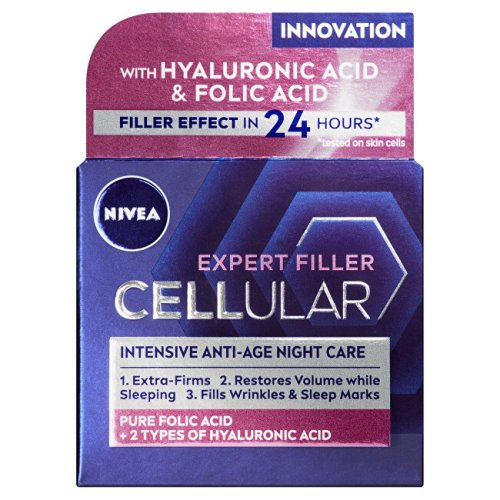 Vybavte se proti vráskám účinnými pomocníky: čistou kyselinou listovou a dvojí kyselinou hyaluronovou. Efekt vyplnění pleti uvidíte již za 24 hodin! NIVEA Noční krém Cellular Expert Filler. Dopřejte své pleti intenzivní regeneraci a vyhlazení i v průběhu noci. Inovativní složení s čistou kyselinou listovou a dvojí kyselinou hyaluronovou (mikro a makro) viditelně vyplní a vypne pleť již za 24 hodin! Zároveň ji intenzivně hydratuje. Čisté složení s luxusní krémovou texturou a růžovou barvou se příjemně nanáší. Již za 4 týdny bude vaše pleť vypadat mladší a díky posílení kožní bariéry může účinně bojovat proti budoucím známkám stárnutí. Pečujte o sebe i v noci: NIVEA Noční krém Cellular Expert Filler.