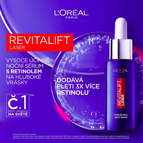 Noční sérum s vysokou koncentrací čistého retinolu redukuje i hluboké vrásky. Zanechá pleť okamžitě hydratovanou, pružnou a viditelně hladší. Již za 1 měsíc používání bude textura pleti jemnější, mladší a zářivější. Za 4 měsíce bude viditelná redukce hlubokých vrásek o 36 %.