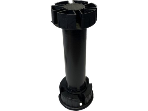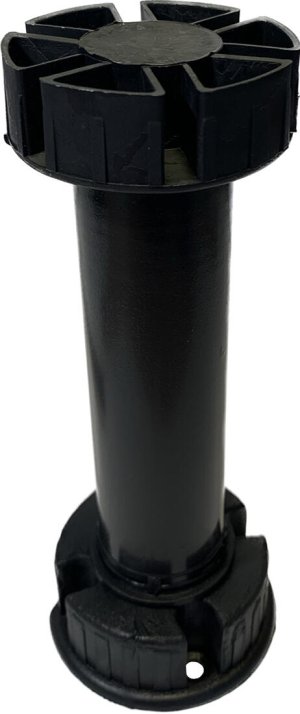Celoplastová třídílná soklová kuchyňská noha z černého plastu, používaná pro ustavení spodních kuchyňských skříněk. Stavitelná, bez klipu na sokl.