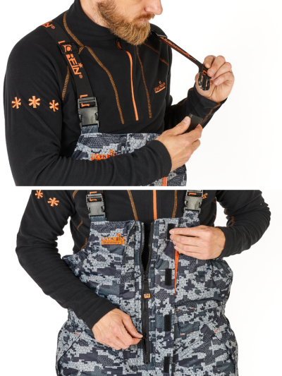 Délkově nastavitelné šle pro optimální pohodlí a padnutí. Dvě praktické kapsy na zip pro uložení drobností. Vyjímatelné měkké vložky v oblasti kolen a sedu pro zvýšený komfort a ochranu. Protisněhové kamaše zabraňující pronikání sněhu do bot. Zapínání nohavic na zip s klopou pro snadné obouvání a zouvání. Dvoucestný zip YKK s ochrannou légou.