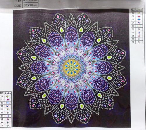 Balení obsahuje: plátno s předtištěným obrázkem, pero na aplikaci kamínků, misku na vysypání kamínků, vosk na nalepení, sadu barevných kamínků Diamantové malování - postup: Horní strana plátna je potažena lepidlem a překrytá průhlednou folií. Folii sundávejte postupně po částech tak, jak budete aplikovat kamínky. Při sejmutí celé folie najednou se může lepicí vrstva znečistit a kamínky by nemusely tak dobře držet. Plátno obsahuje znaky, které jsou uvedeny v přiložené legendě a odkazují na příslušný sáček s kamínky označený číslem. Kamínky z daného sáčku vysypejte do misky. Do hrotu pera naberte vosk, díky kterému se kamínky snadno přichytí na pero. Kamínky perem nanášejte na obrázek. Po nalepení dané barvy kamínky nasypejte zpět do sáčku a pokračujte s další barvou.