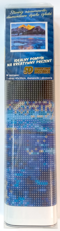 Balení obsahuje: plátno s předtištěným obrázkem, pero na aplikaci kamínků, misku na vysypání kamínků, vosk na nalepení, sadu barevných kamínků Diamantové malování - postup: Horní strana plátna je potažena lepidlem a překrytá průhlednou folií. Folii sundávejte postupně po částech tak, jak budete aplikovat kamínky. Při sejmutí celé folie najednou se může lepicí vrstva znečistit a kamínky by nemusely tak dobře držet. Plátno obsahuje znaky, které jsou uvedeny v přiložené legendě a odkazují na příslušný sáček s kamínky označený číslem. Kamínky z daného sáčku vysypejte do misky. Do hrotu pera naberte vosk, díky kterému se kamínky snadno přichytí na pero. Kamínky perem nanášejte na obrázek. Po nalepení dané barvy kamínky nasypejte zpět do sáčku a pokračujte s další barvou.