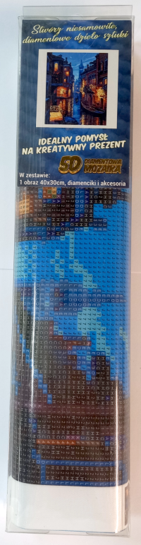Balení obsahuje: plátno s předtištěným obrázkem, pero na aplikaci kamínků, misku na vysypání kamínků, vosk na nalepení, sadu barevných kamínků Diamantové malování - postup: Horní strana plátna je potažena lepidlem a překrytá průhlednou folií. Folii sundávejte postupně po částech tak, jak budete aplikovat kamínky. Při sejmutí celé folie najednou se může lepicí vrstva znečistit a kamínky by nemusely tak dobře držet. Plátno obsahuje znaky, které jsou uvedeny v přiložené legendě a odkazují na příslušný sáček s kamínky označený číslem. Kamínky z daného sáčku vysypejte do misky. Do hrotu pera naberte vosk, díky kterému se kamínky snadno přichytí na pero. Kamínky perem nanášejte na obrázek. Po nalepení dané barvy kamínky nasypejte zpět do sáčku a pokračujte s další barvou.
