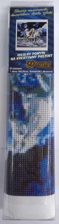 Balení obsahuje: plátno s předtištěným obrázkem, pero na aplikaci kamínků, misku na vysypání kamínků, vosk na nalepení, sadu barevných kamínků Diamantové malování - postup: Horní strana plátna je potažena lepidlem a překrytá průhlednou folií. Folii sundávejte postupně po částech tak, jak budete aplikovat kamínky. Při sejmutí celé folie najednou se může lepicí vrstva znečistit a kamínky by nemusely tak dobře držet. Plátno obsahuje znaky, které jsou uvedeny v přiložené legendě a odkazují na příslušný sáček s kamínky označený číslem. Kamínky z daného sáčku vysypejte do misky. Do hrotu pera naberte vosk, díky kterému se kamínky snadno přichytí na pero. Kamínky perem nanášejte na obrázek. Po nalepení dané barvy kamínky nasypejte zpět do sáčku a pokračujte s další barvou.