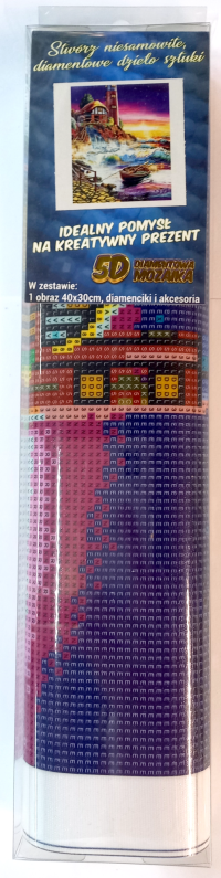 Balení obsahuje: plátno s předtištěným obrázkem, pero na aplikaci kamínků, misku na vysypání kamínků, vosk na nalepení, sadu barevných kamínků Diamantové malování - postup: Horní strana plátna je potažena lepidlem a překrytá průhlednou folií. Folii sundávejte postupně po částech tak, jak budete aplikovat kamínky. Při sejmutí celé folie najednou se může lepicí vrstva znečistit a kamínky by nemusely tak dobře držet. Plátno obsahuje znaky, které jsou uvedeny v přiložené legendě a odkazují na příslušný sáček s kamínky označený číslem. Kamínky z daného sáčku vysypejte do misky. Do hrotu pera naberte vosk, díky kterému se kamínky snadno přichytí na pero. Kamínky perem nanášejte na obrázek. Po nalepení dané barvy kamínky nasypejte zpět do sáčku a pokračujte s další barvou.
